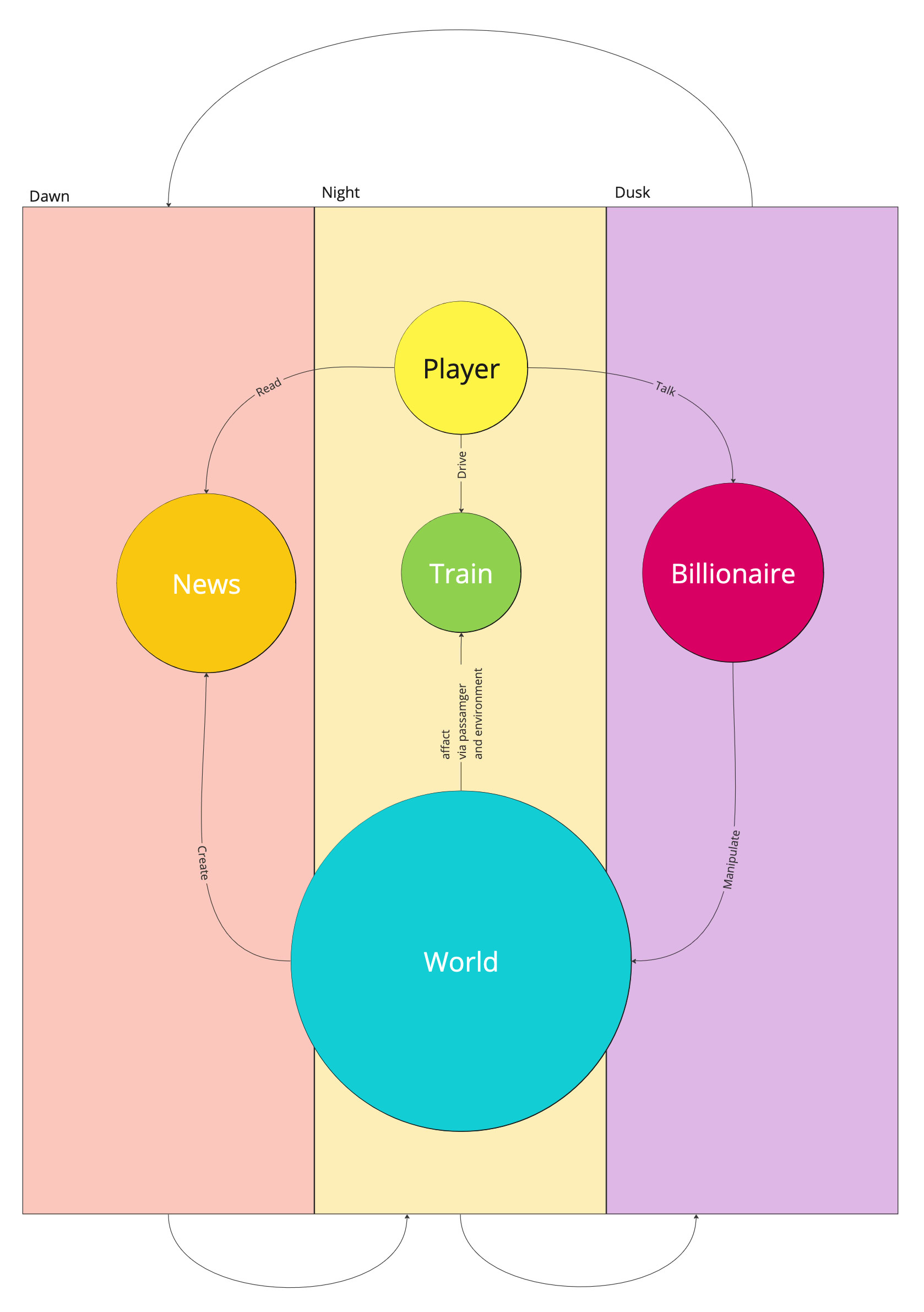 Driving the train became harder, and any delay will eat into the time to progress the conversation with the stranger. It becomes apparent that the stranger applies the same logic in the discussion to manipulate world events, and in the second half of the game, the player can challenge the stranger, reveal his identity, and perhaps restore some balance to the world.
